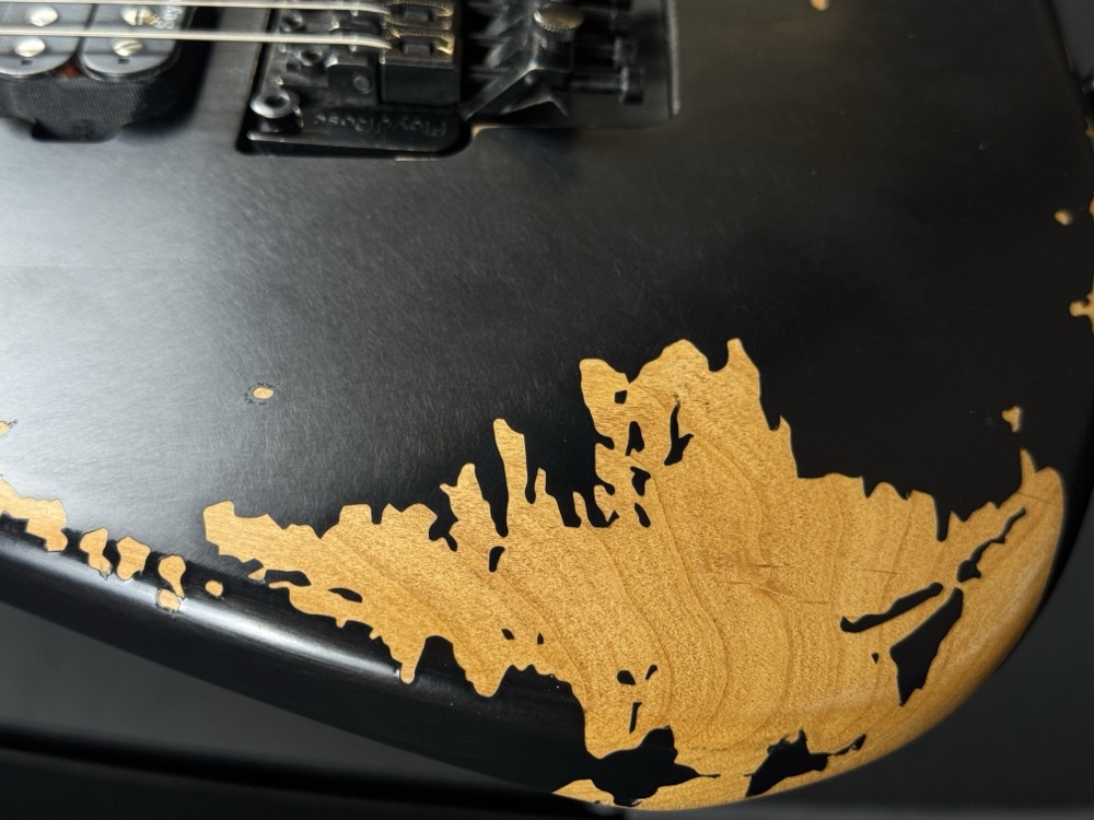 This guitar is an excellent, beefed up Strat style guitar featuring mighty Seymour Duncan pickups, Floyd Rose bridge, and artfully distressed nitrocellulose lacquer finished body.