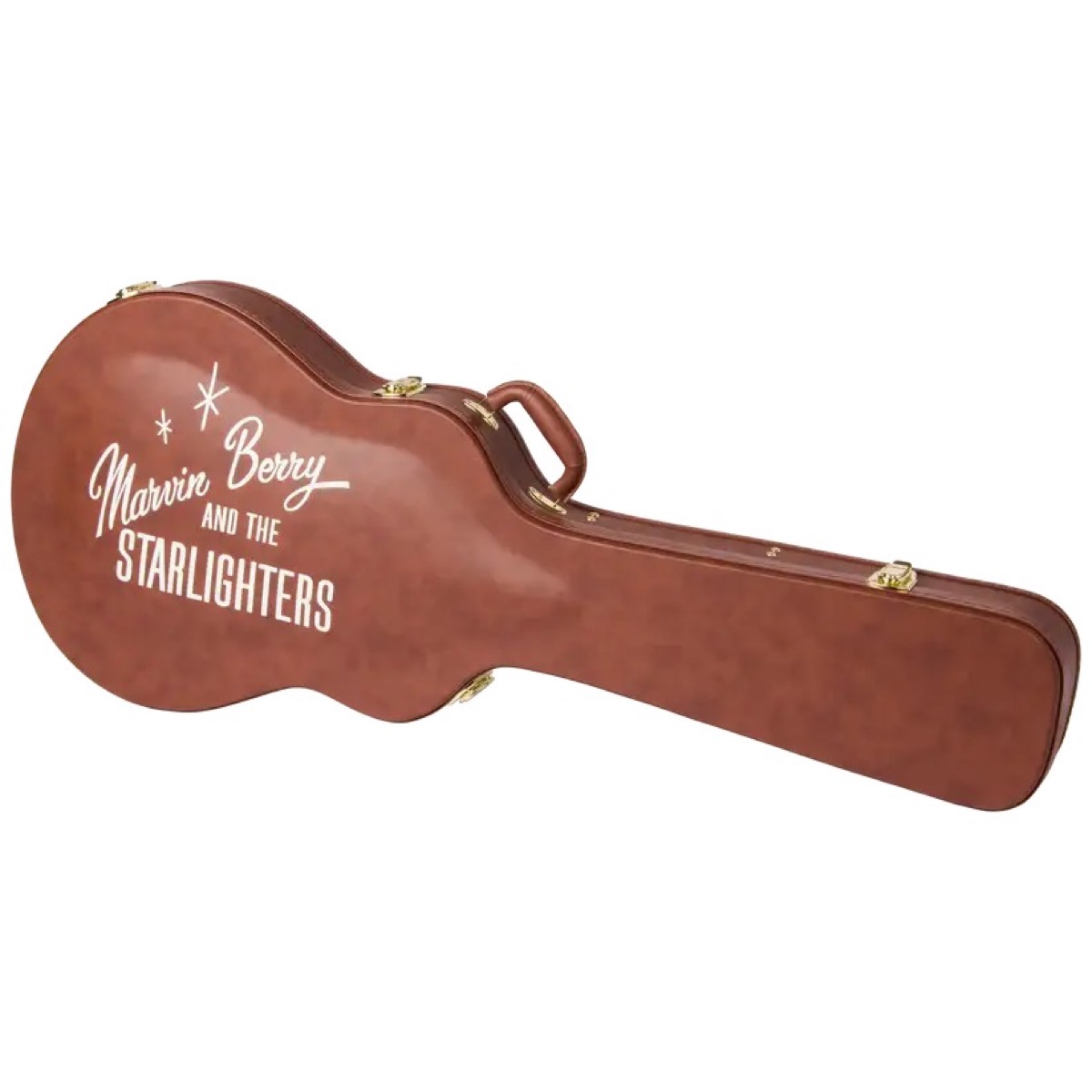 The Epiphone logo and Gibson Crown are inlaid in mother of pearl. On the back of the headstock, in a nod to the movie, you'll find a Hill Valley Music store decal. The Back to the Future ES-345 has gold hardware, including an Epiphone LockTone Tune-O-Matic bridge and a Bigsby B70 vibrato tailpiece, and just like the guitar in the movie, the original Stop Bar studs are left in place. The Back to the Future ES-345 is powered by two of Epiphone's acclaimed Alnico Classic PRO pickups, each with individual volume and tone controls. A mono Varitone provides even more tonal versatility. It even comes packed in a vintage-style hardshell case with Marvin Berry and the Starlighters graphics.