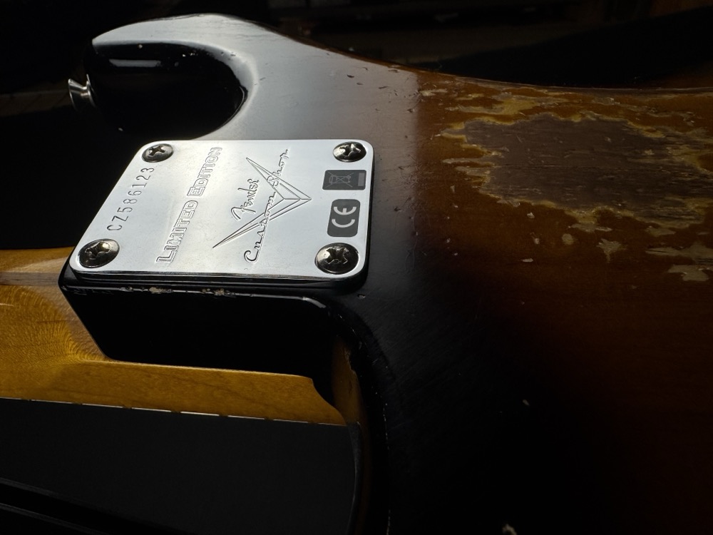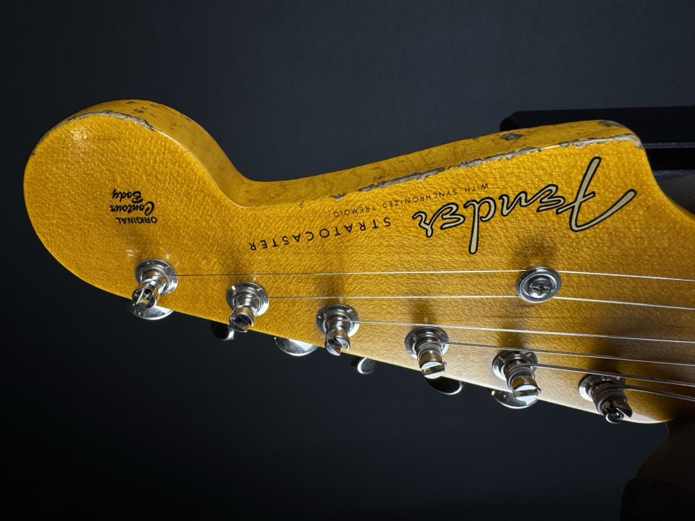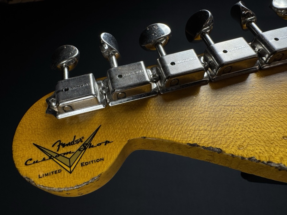 This outstanding Custom Shop Stratocaster is so light it feels like it could float away! Aside from the amazing weight, this guitar feels incredible. The neck is super smooth and comfortable, but with a gorgeous worn-through-the-lacquer relic job that leaves the next amazingly fast feeling. This guitar totally nails the iconic mid-50's Strat!