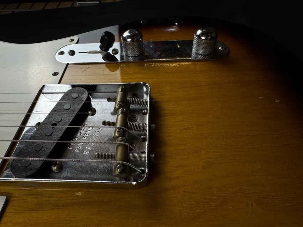 Harwdware features Vintage Style Fender Branded Machine heads, Vintage Fender '51-'54 Telecaster Bridge Assembly, '52 Knurled Chrome Control Knobs.