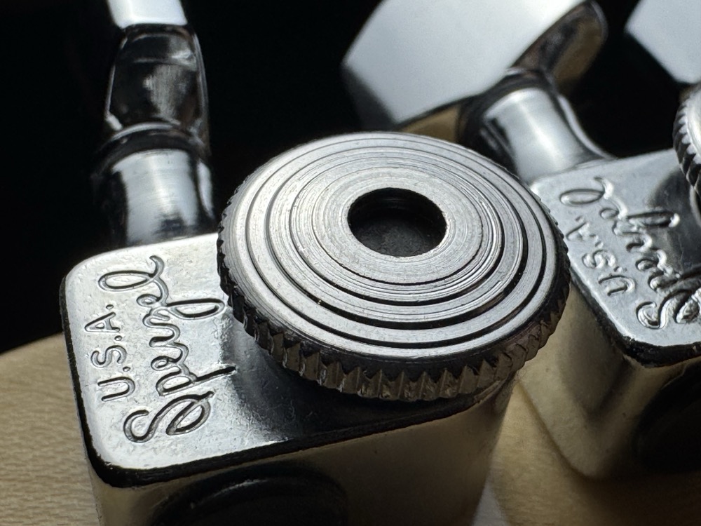 - Four-bolt neck plate; Sperzel Trim-Lok staggered tuning machines