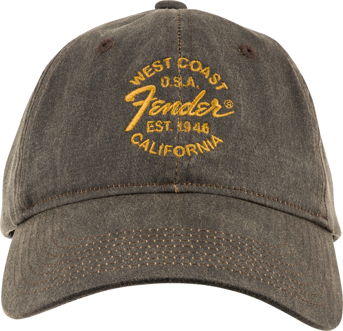 A classic dad hat with bold West Coast attitude. Crafted from soft, washed twill cotton in an oil color finish, this unstructured 6-panel hat brings vintage, old-school style to any outfit. Featuring a gold embroidered “West Coast” logo on the front, it’s the perfect everyday hat to show off your Fender pride. Finished with a metal adjuster for a custom, all-day comfortable fit.