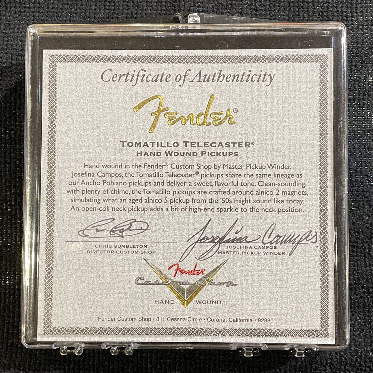 These incredible Telecaster "Tomatillo" pickups were hand-wound in the Fender Custom Shop by the legendary Josefina Campos, whose history with Fender is a direct link to the golden era of Fender production, and electric guitar making at large. These pickups are in high demand by the Fender Custom Shop, so not many make it to the retail consumer market. The vast majority of these pickups are reserved for guitars in the $5000+ range, but we were lucky enough to receive a set of these rare gems.