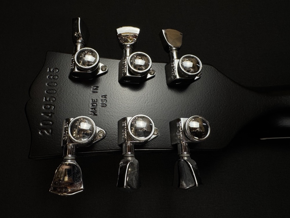 - Ebony fretboard with a compound radius, 22 medium jumbo frets, and mother of pearl trapezoid inlays