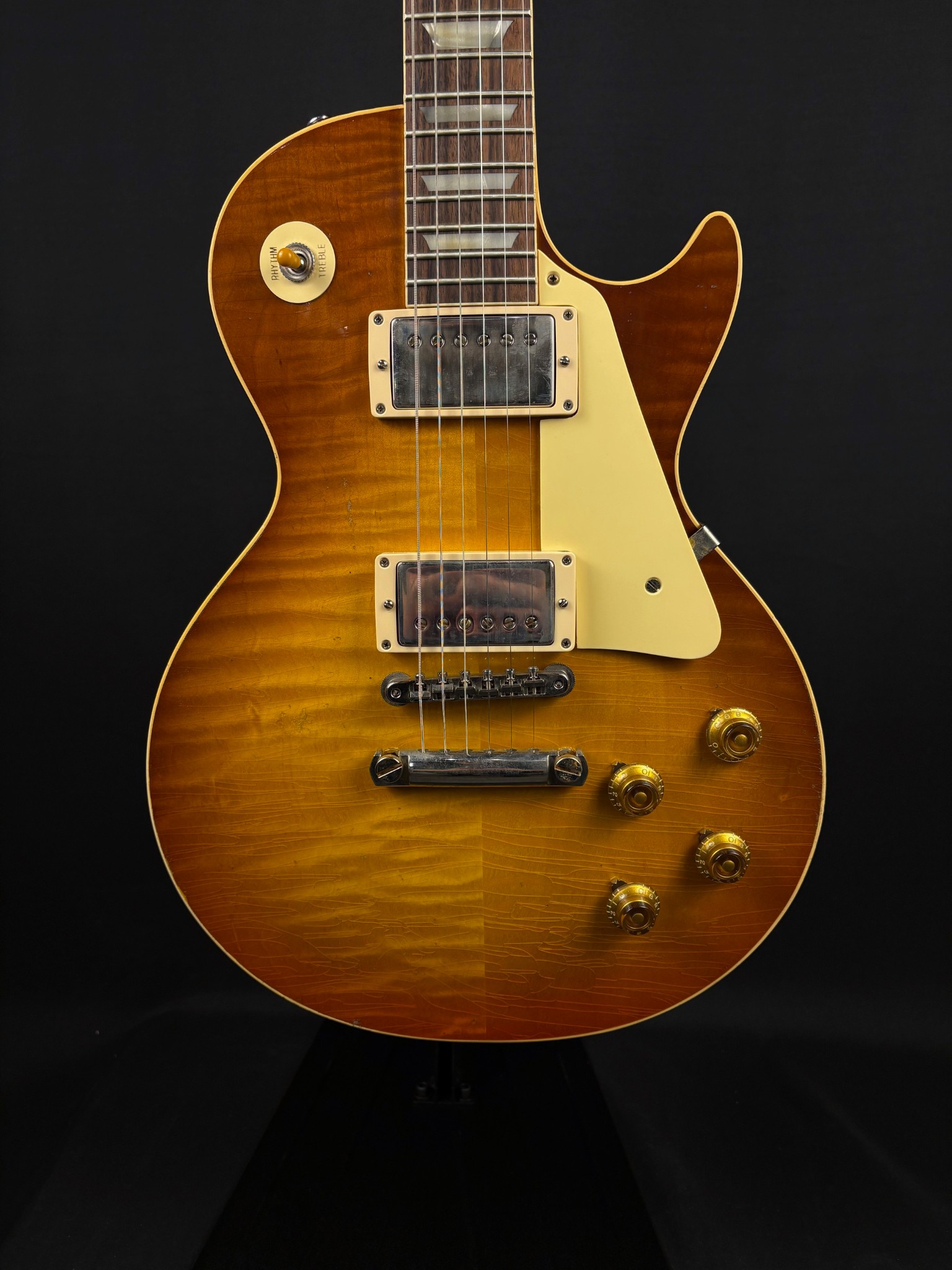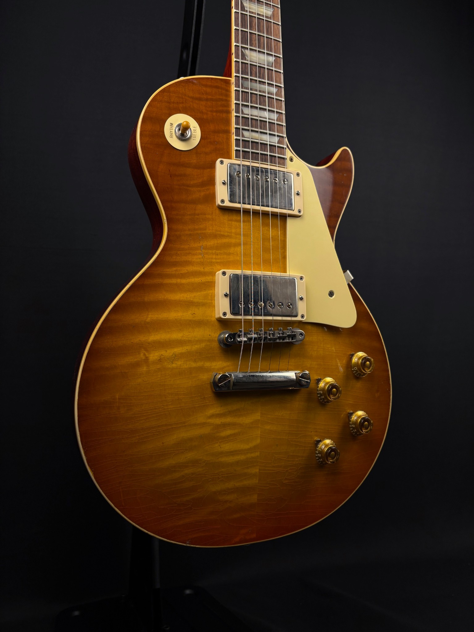 Don't stay two chevrons back from this chevroned beauty in delightfully light aged perfection. Weighing in at a delightful 8.6 pounds, this Gibson Custom Shop's 1959 Les Paul Standard Reissue is not just a tribute to the priceless original models - it's a clone of them. From laser-scanned dimensions to chemically-recreated plastics to colour-matched shades of sunburst, every element has been rendered in unbelievable detail. It represents the culmination of decades of work by Custom Shop's expert team - a tireless quest to bring accuracy and authenticity to the hands of fans. Its the definition of cool, and it's the best representation of the 1959 Les Paul Standard since the Gibson Custom Shop began making Historic Reissues over twenty-five years ago. It features Light Aging by the skilled artisans of the Murphy Lab. The Murphy Lab Light Aged finish treatment, paired with lightly aged hardware, simulates decades of natural play wear, giving it the unique character, vibe, and feel of an original example from the Gibson Golden Era.