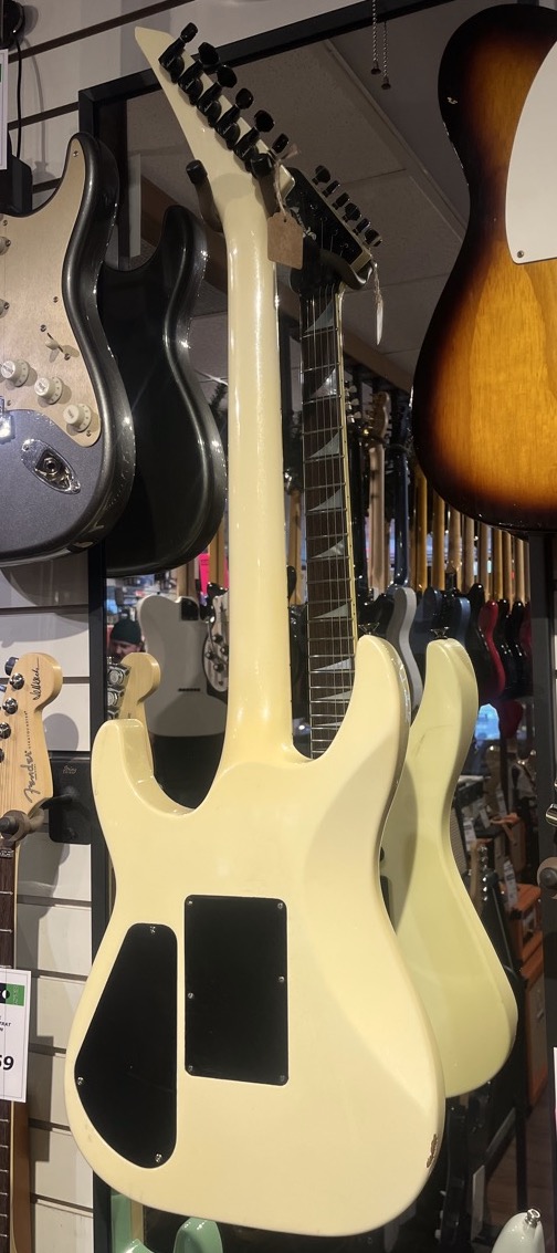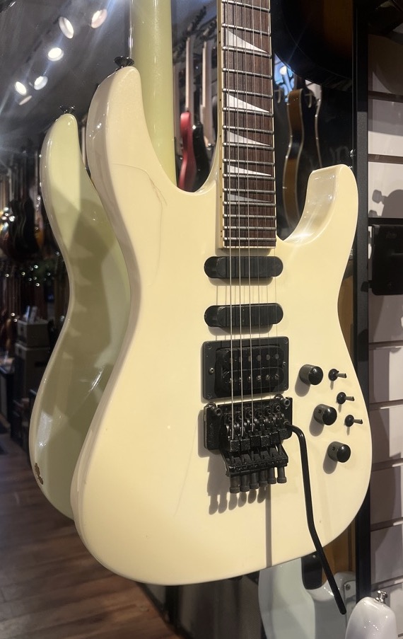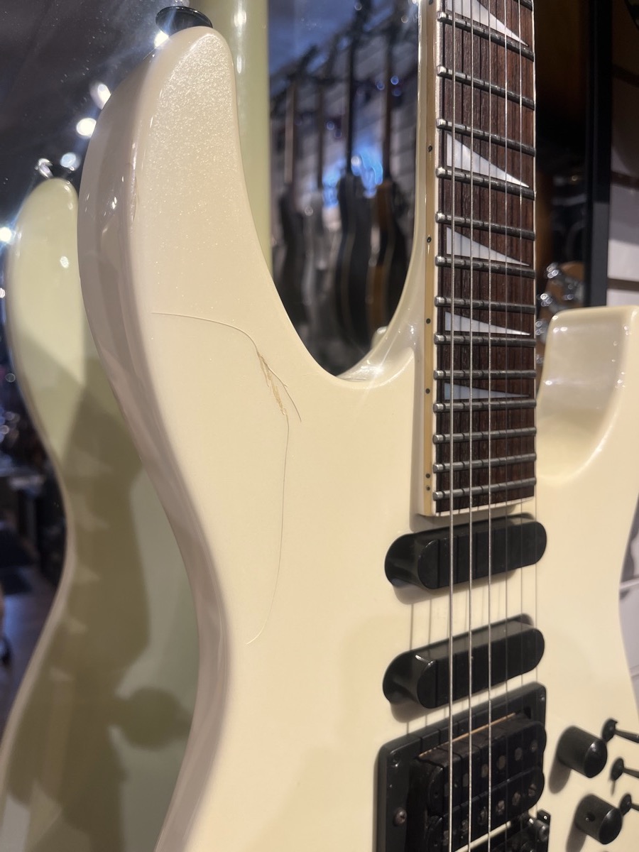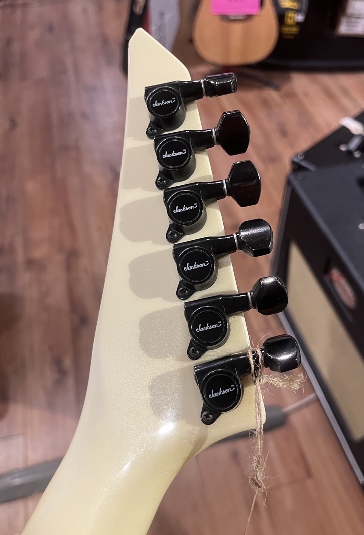 This is almost 40 years old(!) The Model 6 came out in 1986 and this guy, from 1987, finished in wonderful Pearl White, was the first to feature the new Jackson Branded JT6 Locking tremolo licensed by Floyd Rose. The Black Grover tuners are branded "Jackson" too.