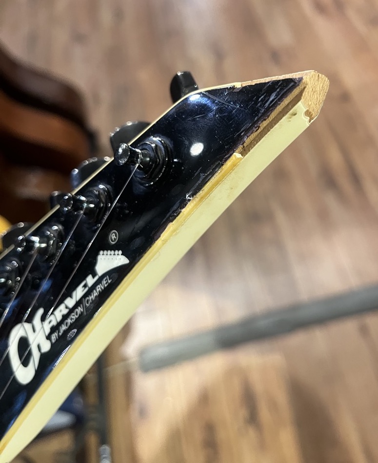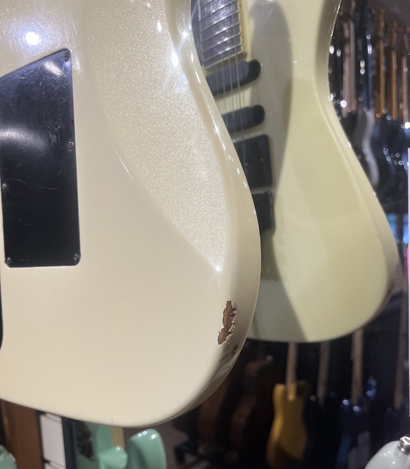 This Used guitar is in Good++ Condition. Realistically, I would say in Very Good Condition but there are a couple of cosmetic wear marks - most notable is the lacquer crack in the gloss pear white finish on the face of the body (seen in the picture) and, the 2 dings - one in the body and one on the end of the pointy headstock - par for the course with the pointy bits.