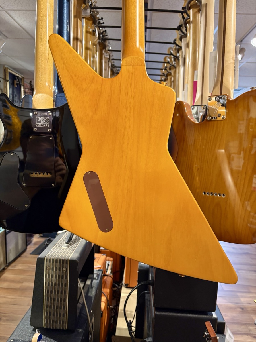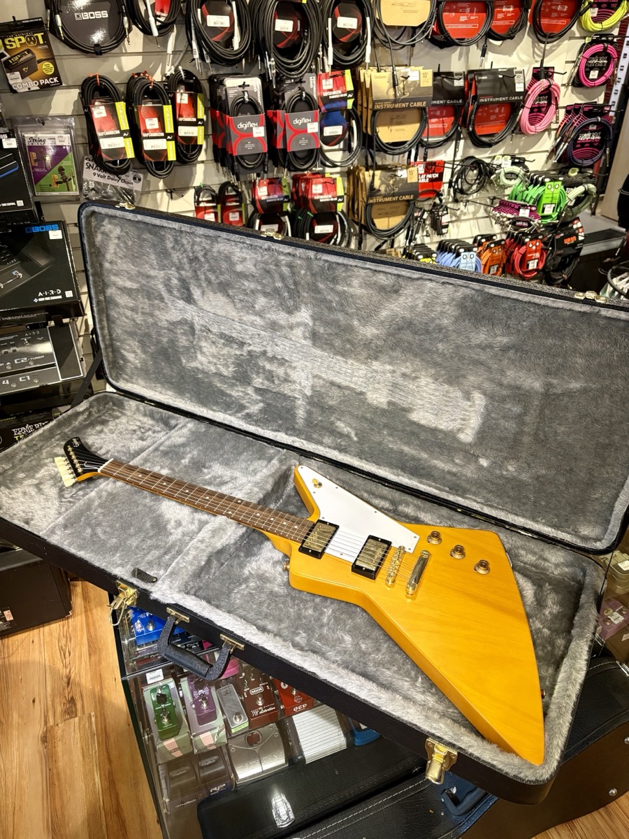 "Made in partnership with the Gibson Custom Shop, the 1958 Korina Explorer is Epiphone’s impressive recreation of one of the most famous and valuable vintage guitars ever made. It brings authentic 1958 Explorer details to guitarists everywhere at a breakthrough price. Like the ultra-rare original Gibson models from 1958, it features a solid Korina body and a Korina neck with a long neck tenon and a 1958 Explorer neck profile. It is also equipped with an Indian laurel fretboard and gold hardware. The electronics are also top-notch, with Gibson Burstbucker™ 2 and Burstbucker 3 pickups wired to individual volume controls and a master tone control with CTS pots and a Mallory capacitor, along with a Switchcraft 3-way pickup selector switch and 1/4” output jack. An Epiphone x Gibson Custom logo on the back of the headstock is also proudly displayed, and a hardshell case is also included."