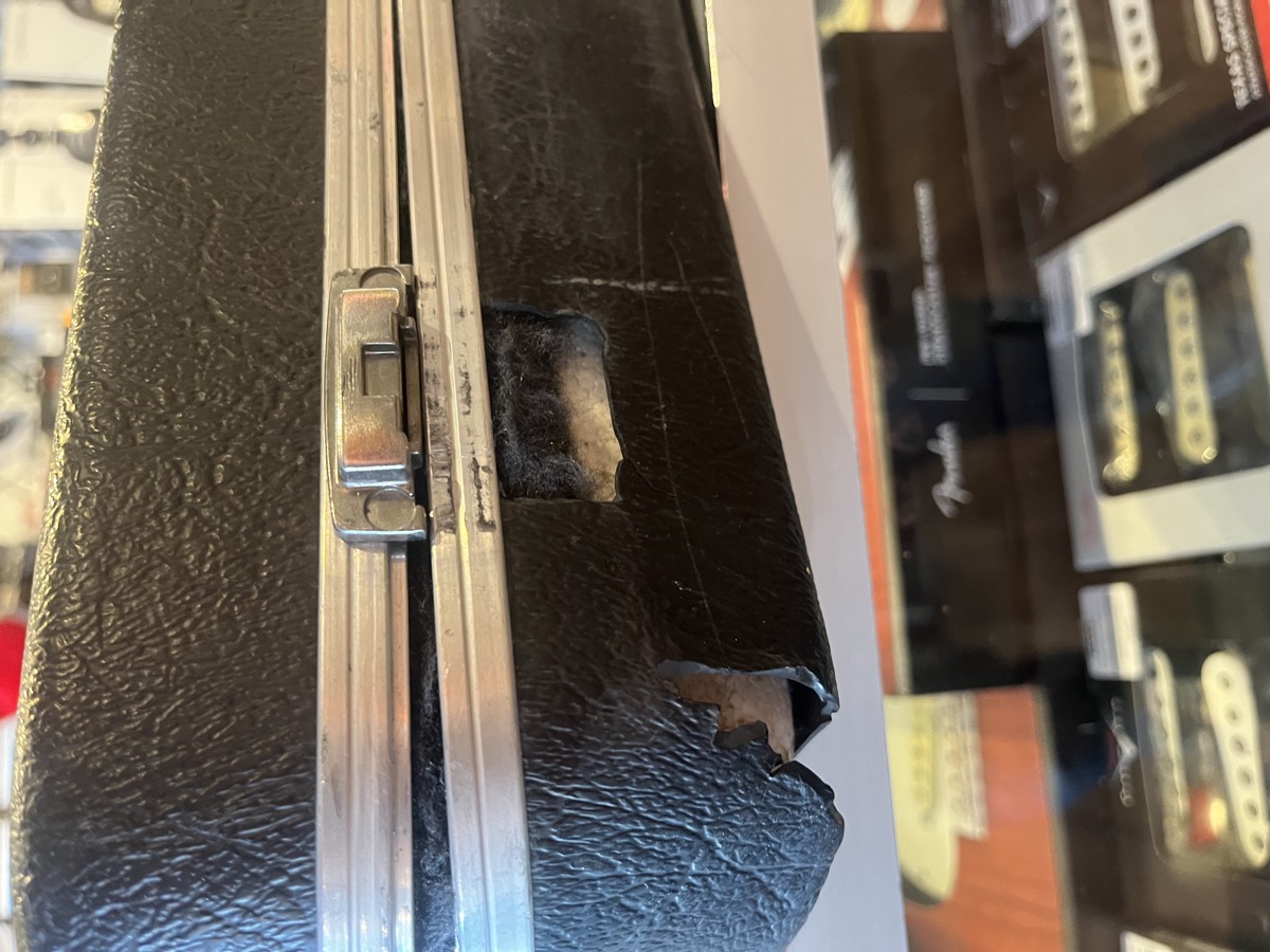 The Original case has done it's job over the years and has seen better days. Missing a Latch and has a hole in it up near the top of the case where the missing latch is.
