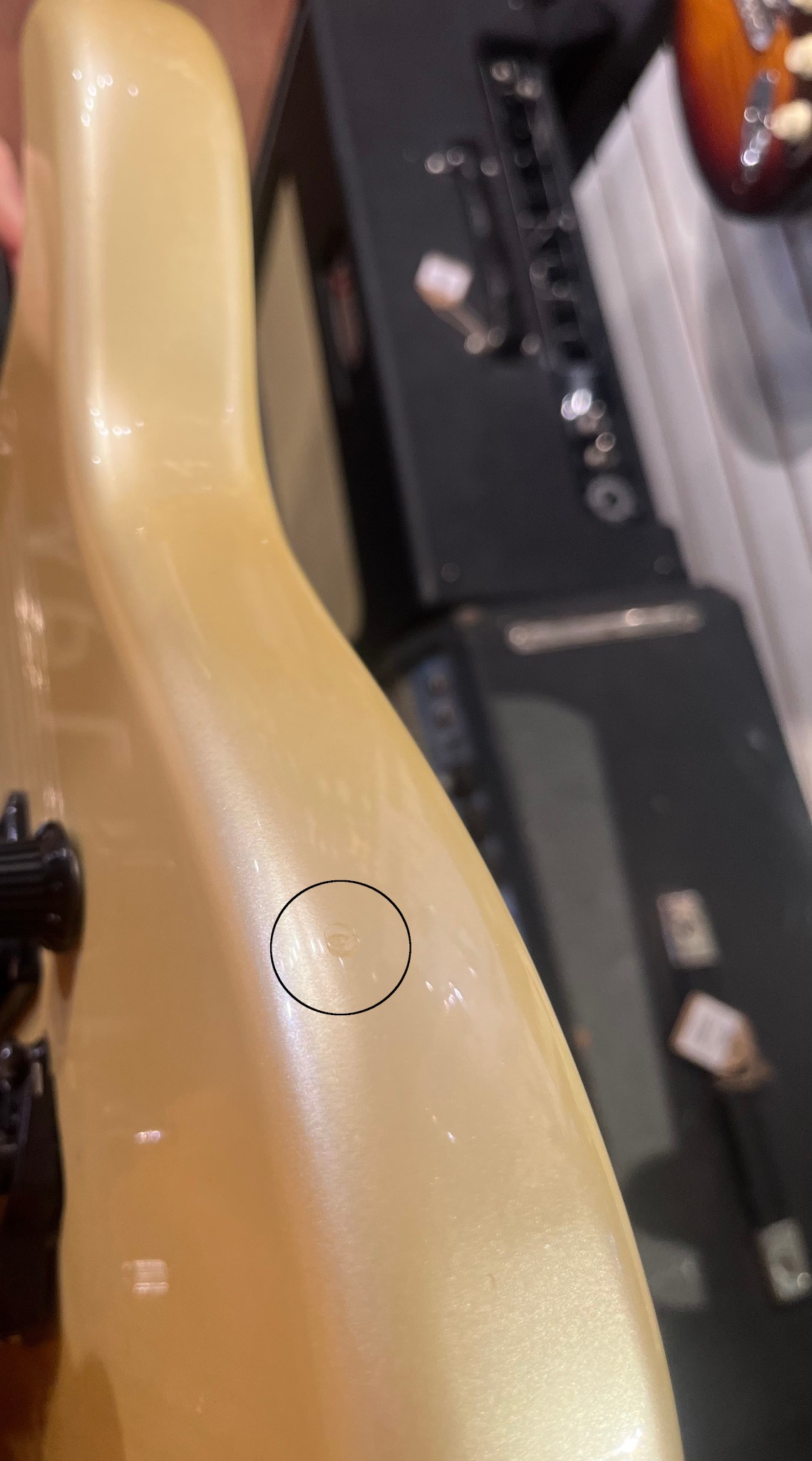 This Used guitar is in Excellent condition with a few small minor play wear marks, only notable is a slight impression in the finish along the side of the body new the input jack.