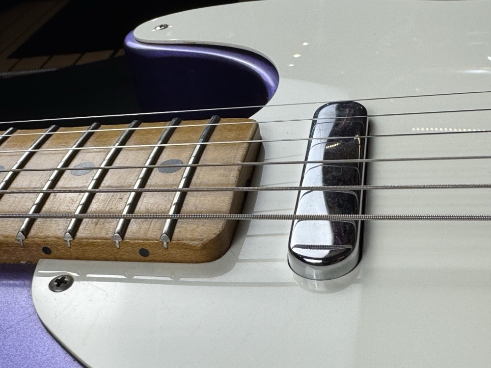 6 String Electric Guitar featuring a solid Alder body with limited worn FSR Nitro Purple Metallic finish, maple neck, tex mex pickups in Excellent Road Worn Condition.