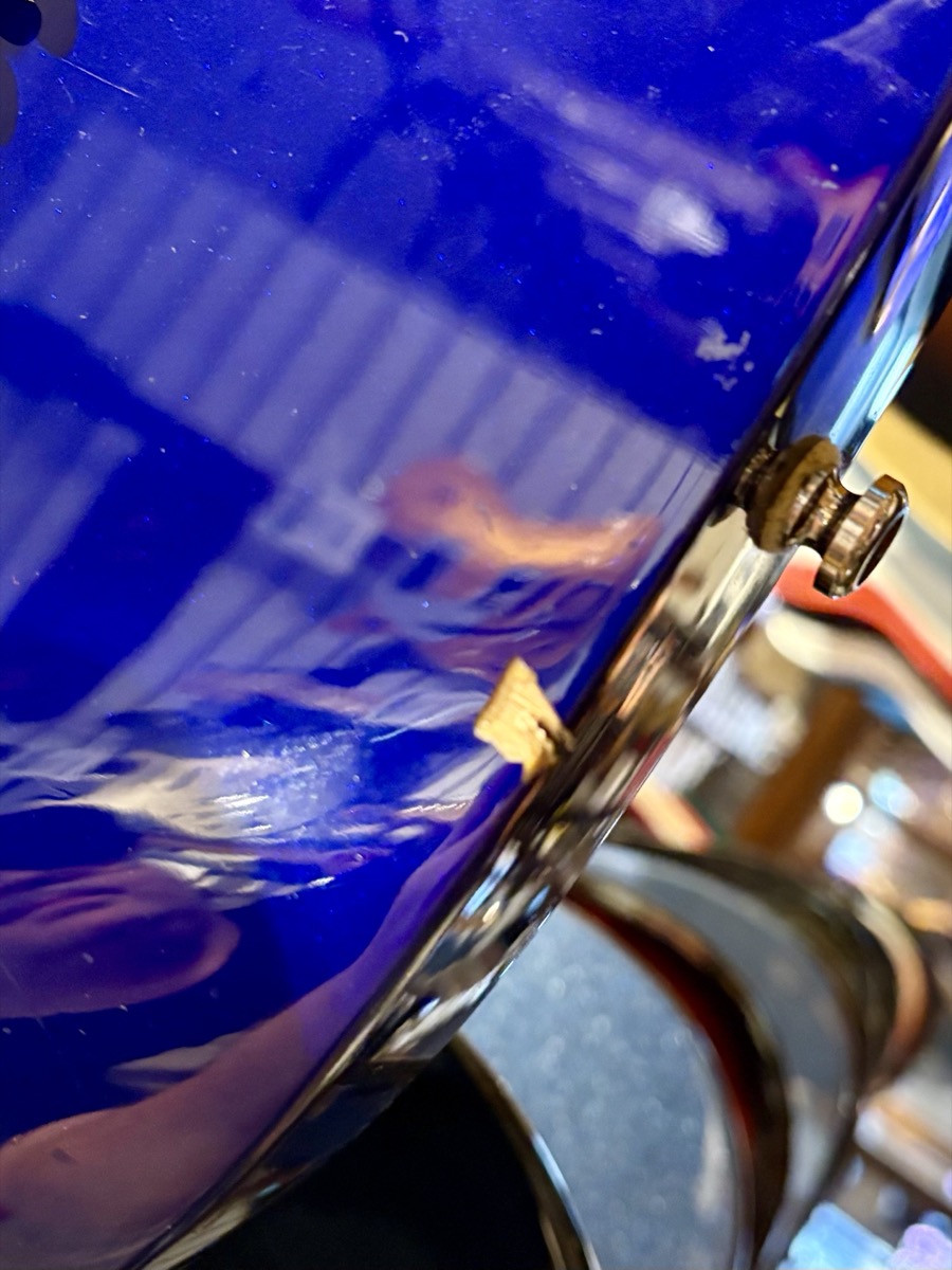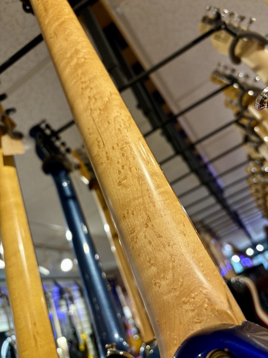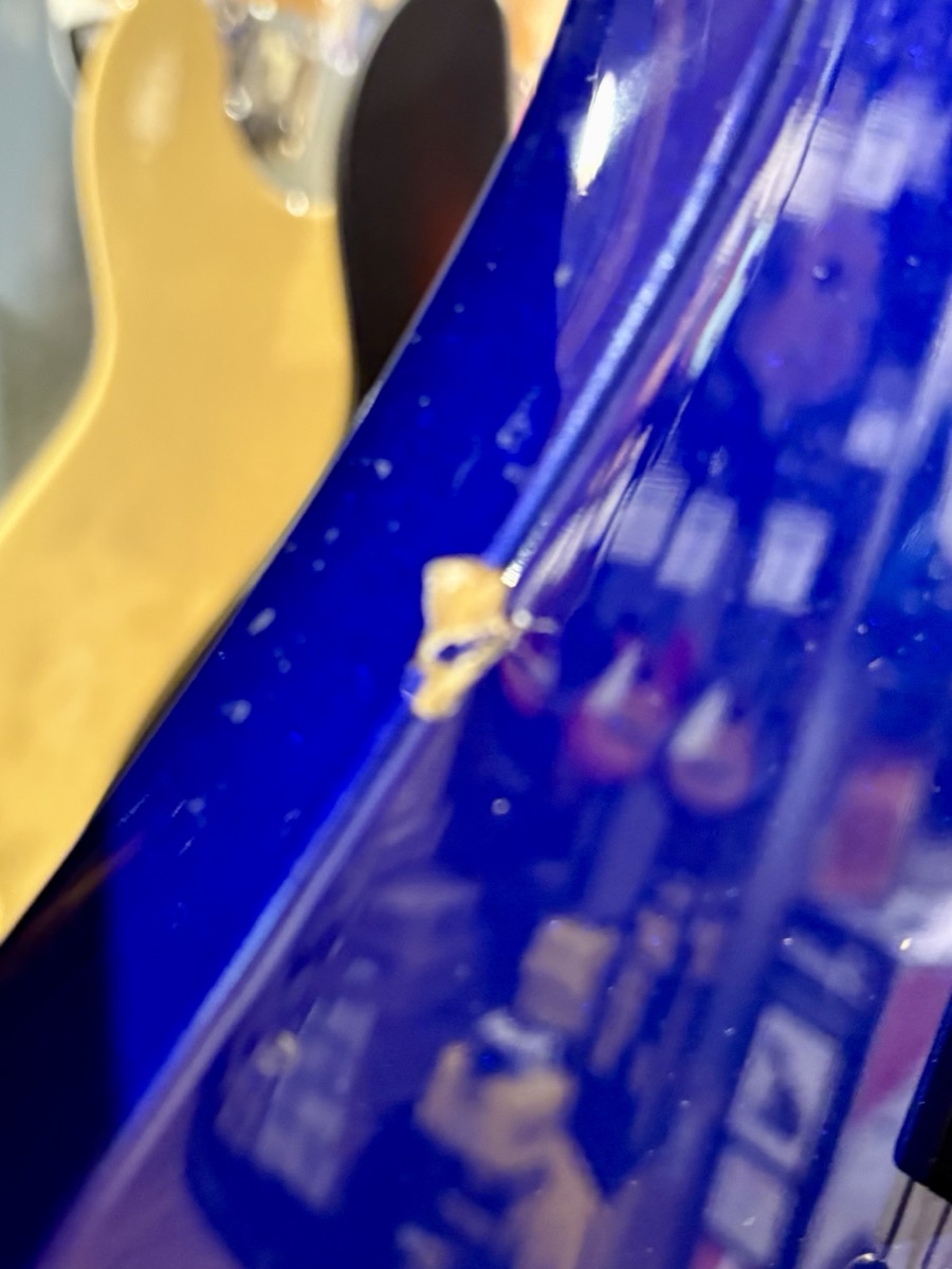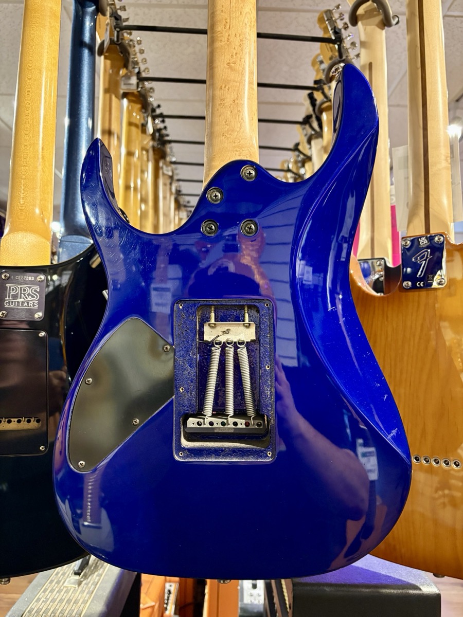 This is an awesome Ibanez guitar!! It has a few battle scars, but plays great and sounds awsome. There is even a little birdseye on the back of the neck!! The Jewel Blue colour looks slighty purple is some light. Come with the bar and cool mojo!!