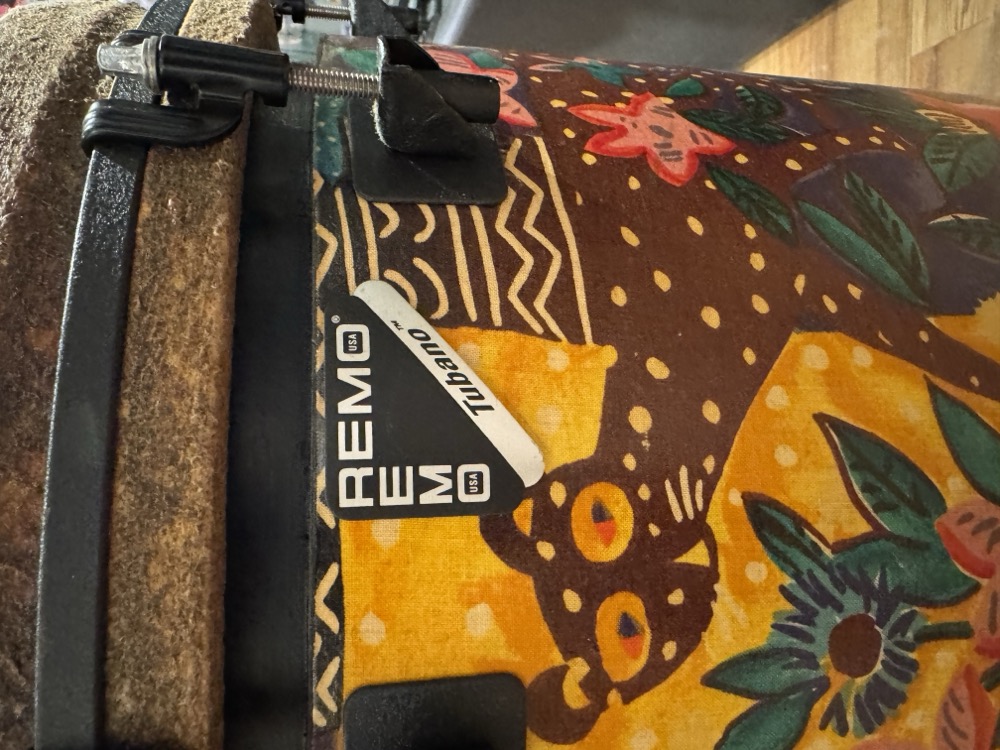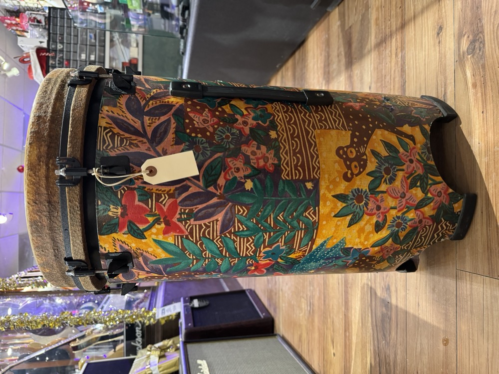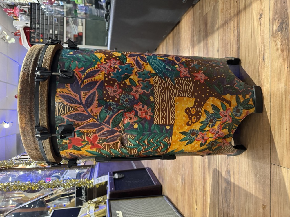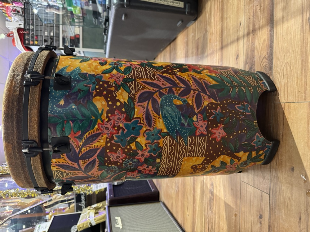 This used drum, made by Remo, sounds fantastic! Rich, low-yet-cutting tones just like your favourite conga drums, but in a convenient form factor. This drum is easy to transport, and doesn't require a stand to get the full bass tones like more traditional hand drums.