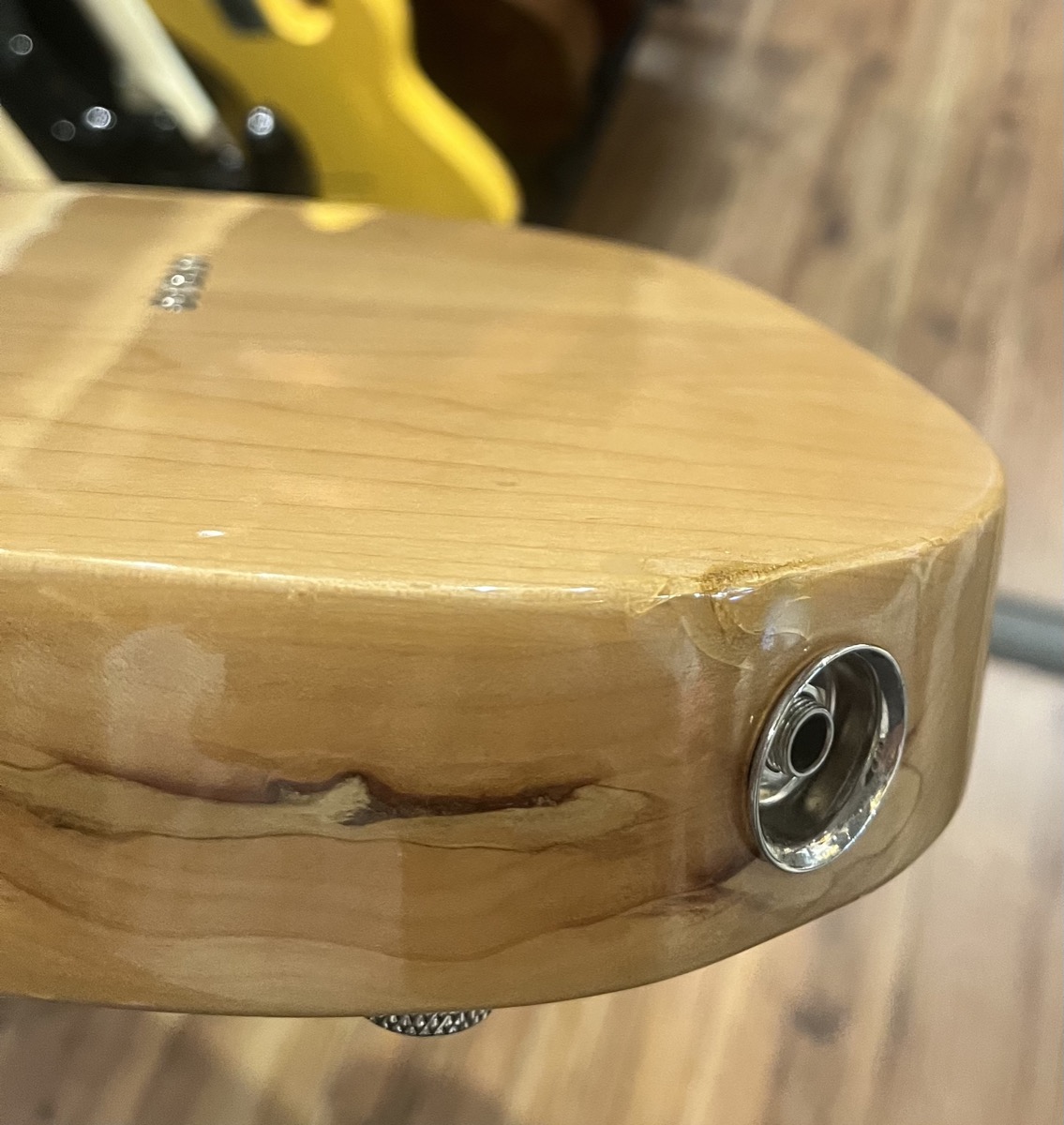 Most notable is a small ding in the lacquer by the jack, this has been spot filled so it's smooth to the touch but you can still see the ding.