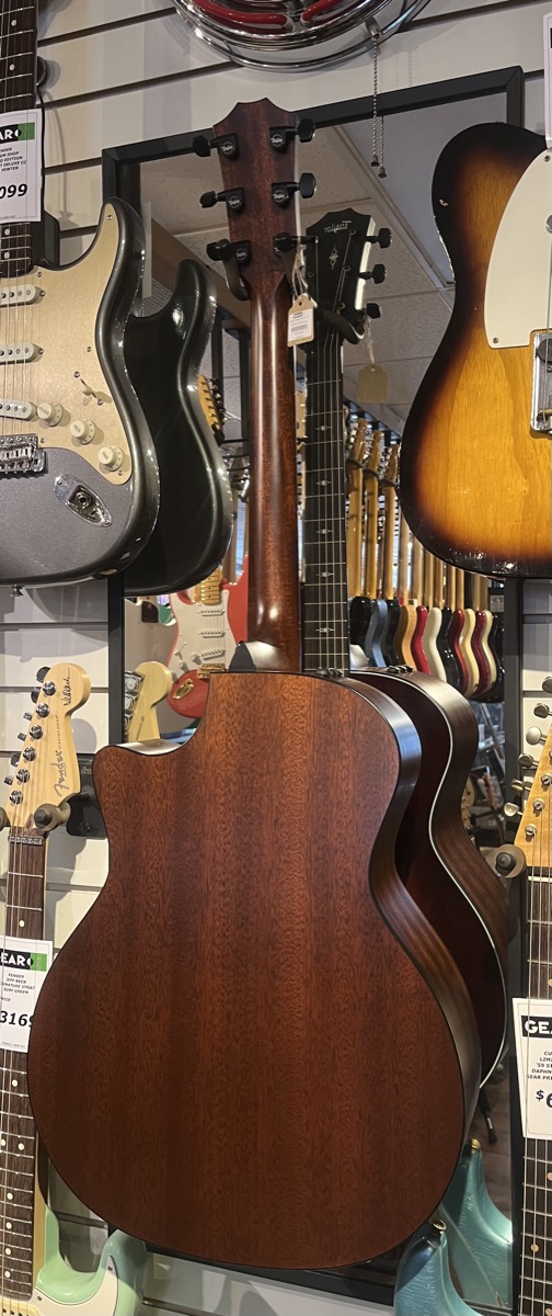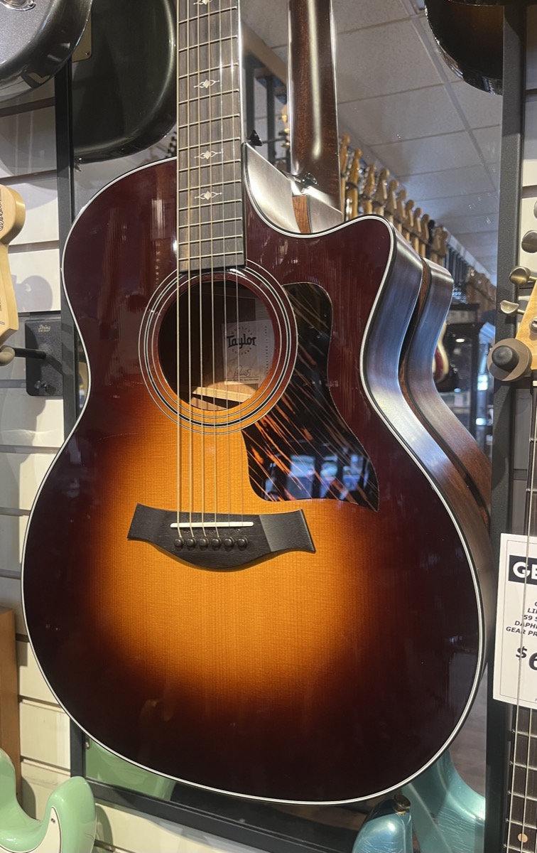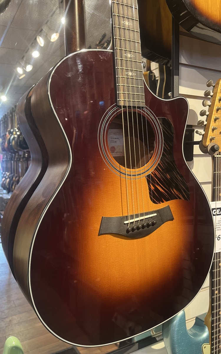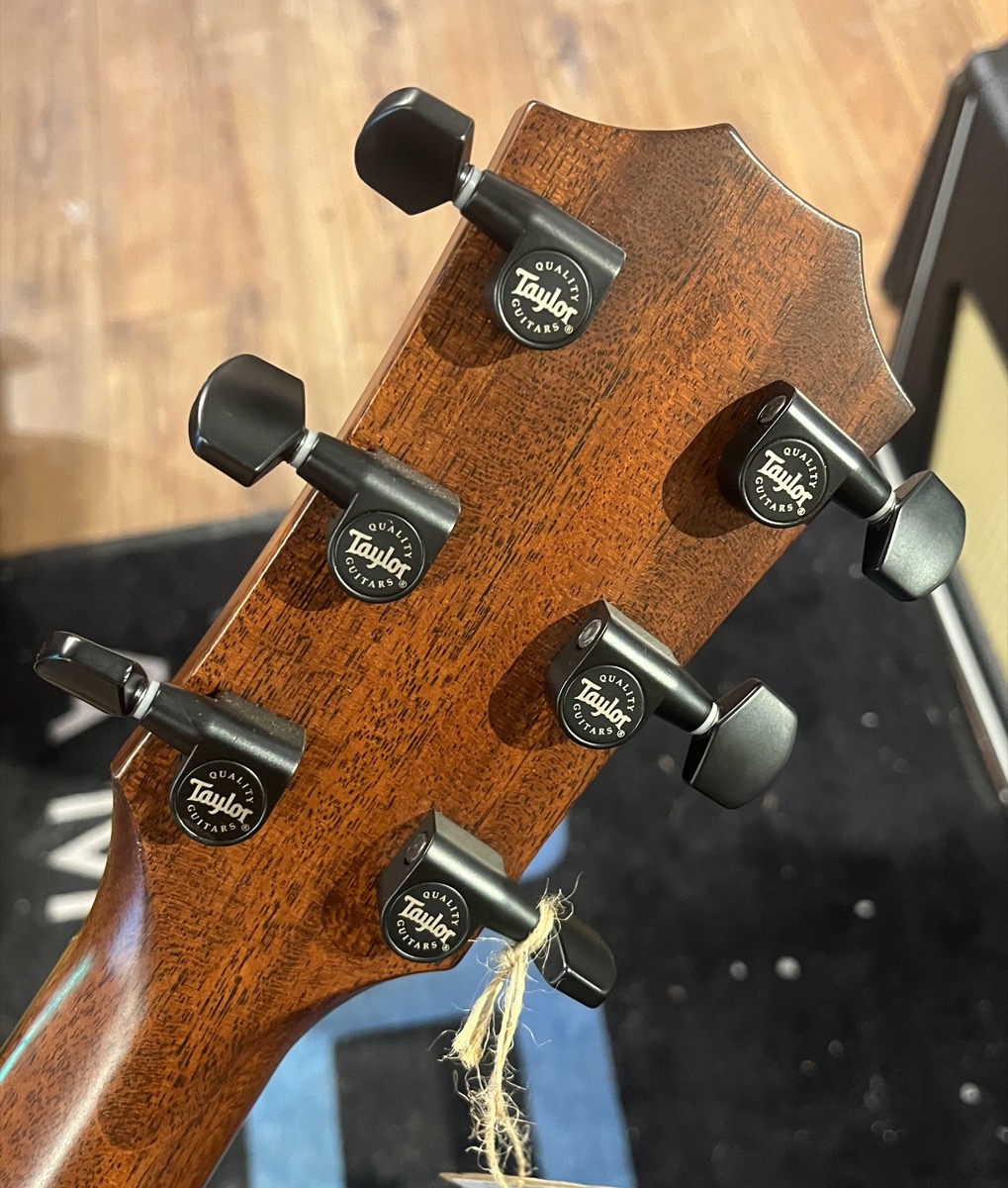 All solid wood construction featuring a Sitka Spruce Top and Sapele Back and Sides finished in Vintage Sunburst and firestrip pickguard with Taylor's V-Class Bracing - designed to increase sustain and volume.