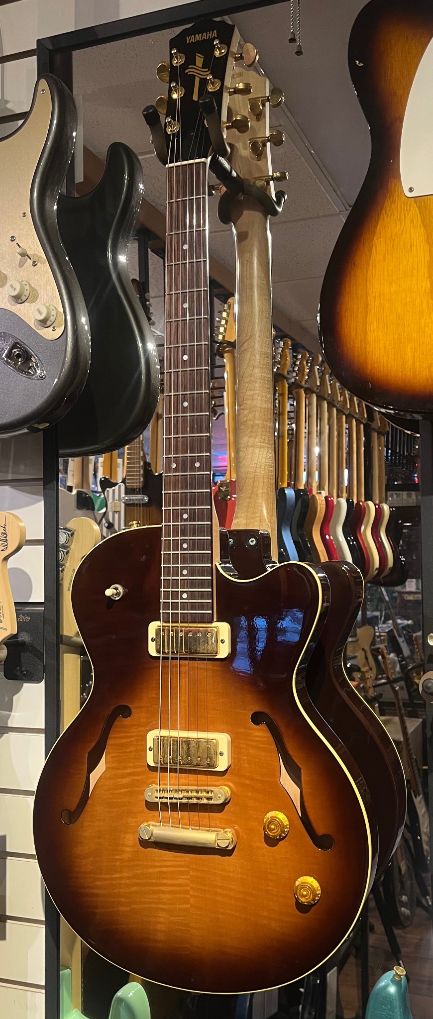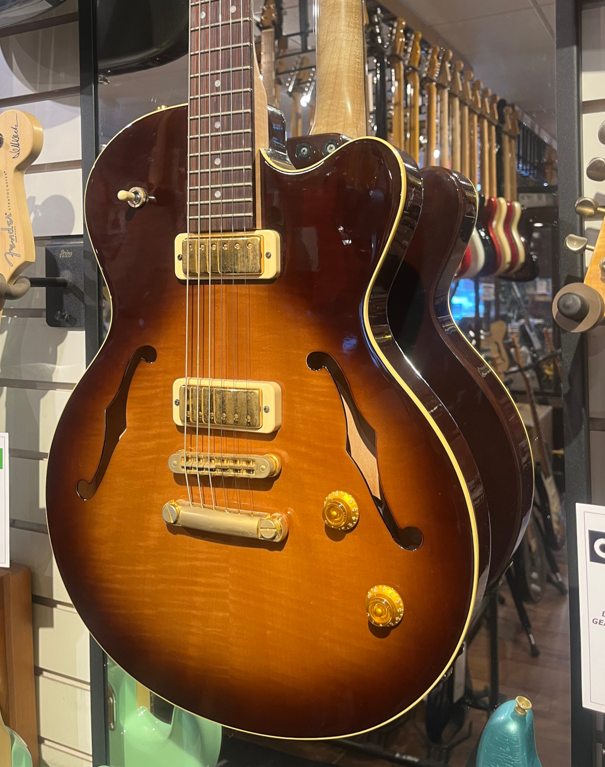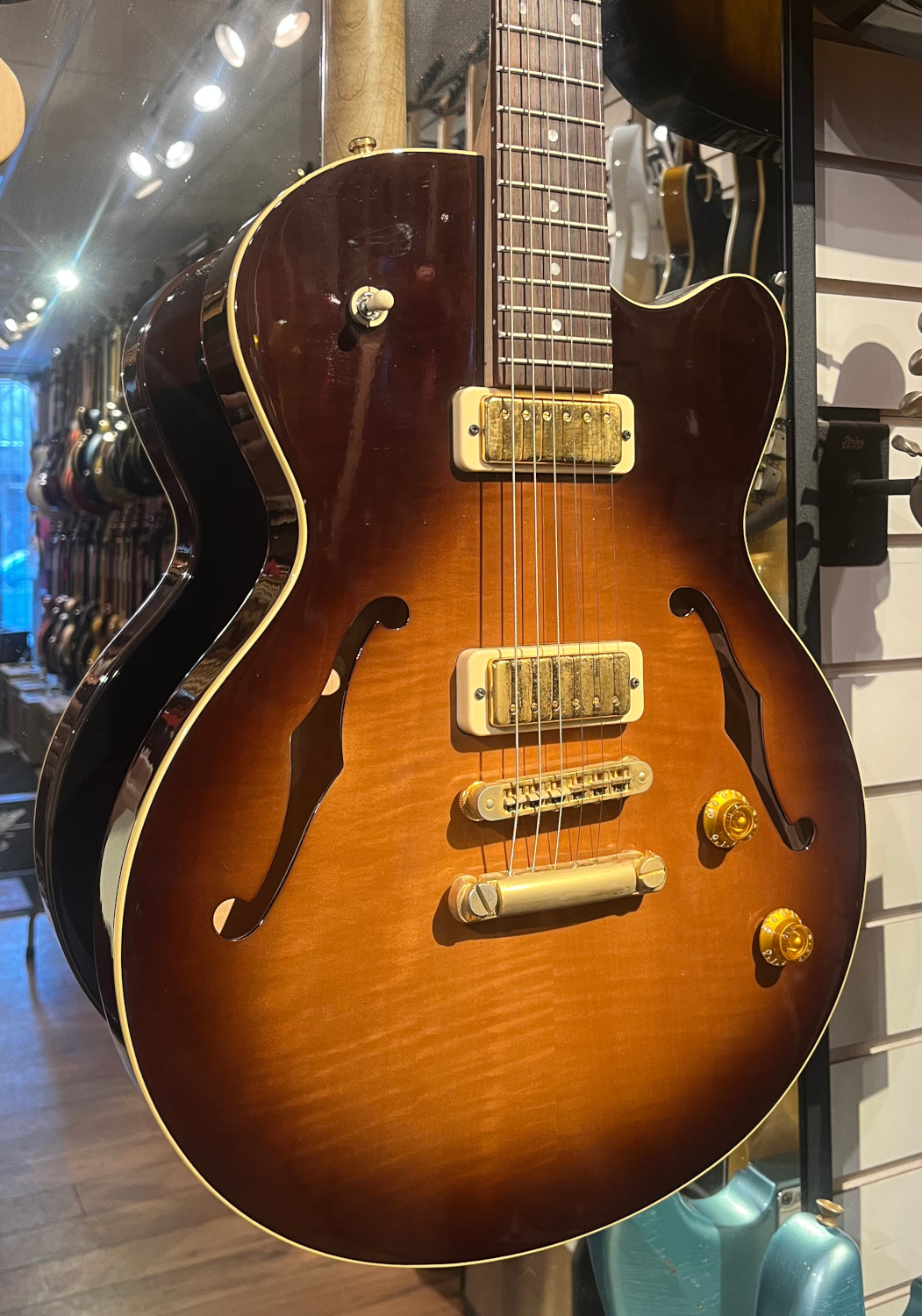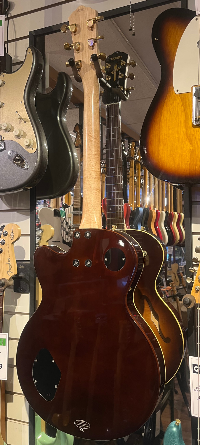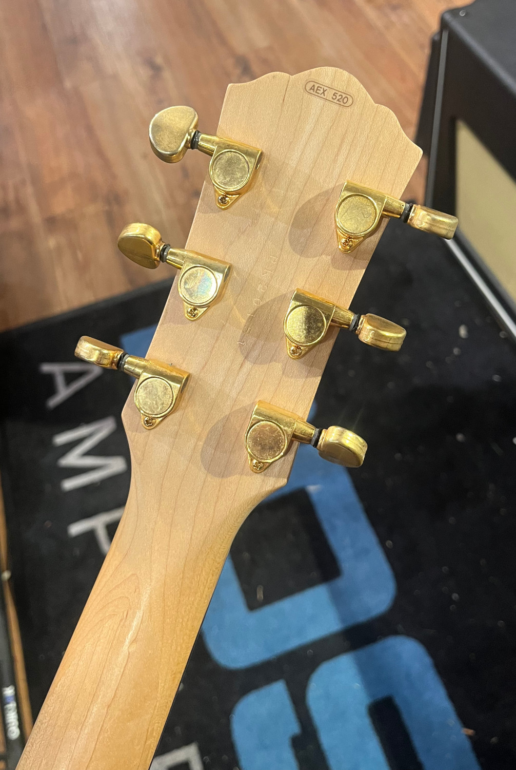 This AEX 520 Features an Alder, semi hollow single cutaway body with a figured maple veneer top, finished in a "Brown Sunburst".