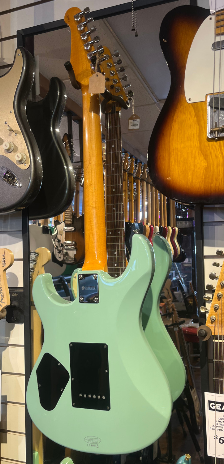 This little beauty has an Alder body, finished in a wonderful vintage Sonic Blue, bolt on Maple neck with rosewood fingerboard, 22 frets, Strat Scale Length and a 13.75" neck radius. It's a very comfortable neck to play.